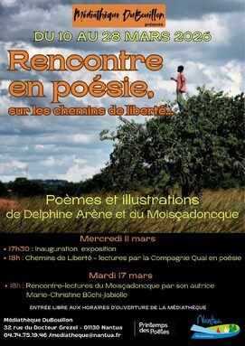 Par VERONIQUE VIALLE, publié le samedi 7 mars 2026 19:13 - Mis à jour le samedi 7 mars 2026 19:13Le Printemps des poètes sera mis à l'honneur à la médiathèque de Nantua avec deux femmes dont l'oeuvre sera mise en lumière : Marie-Christine Büchi-Jabiolle et Delphine Arène. Les élèves de 5e Français 3 iront découvrir cette exposition. -