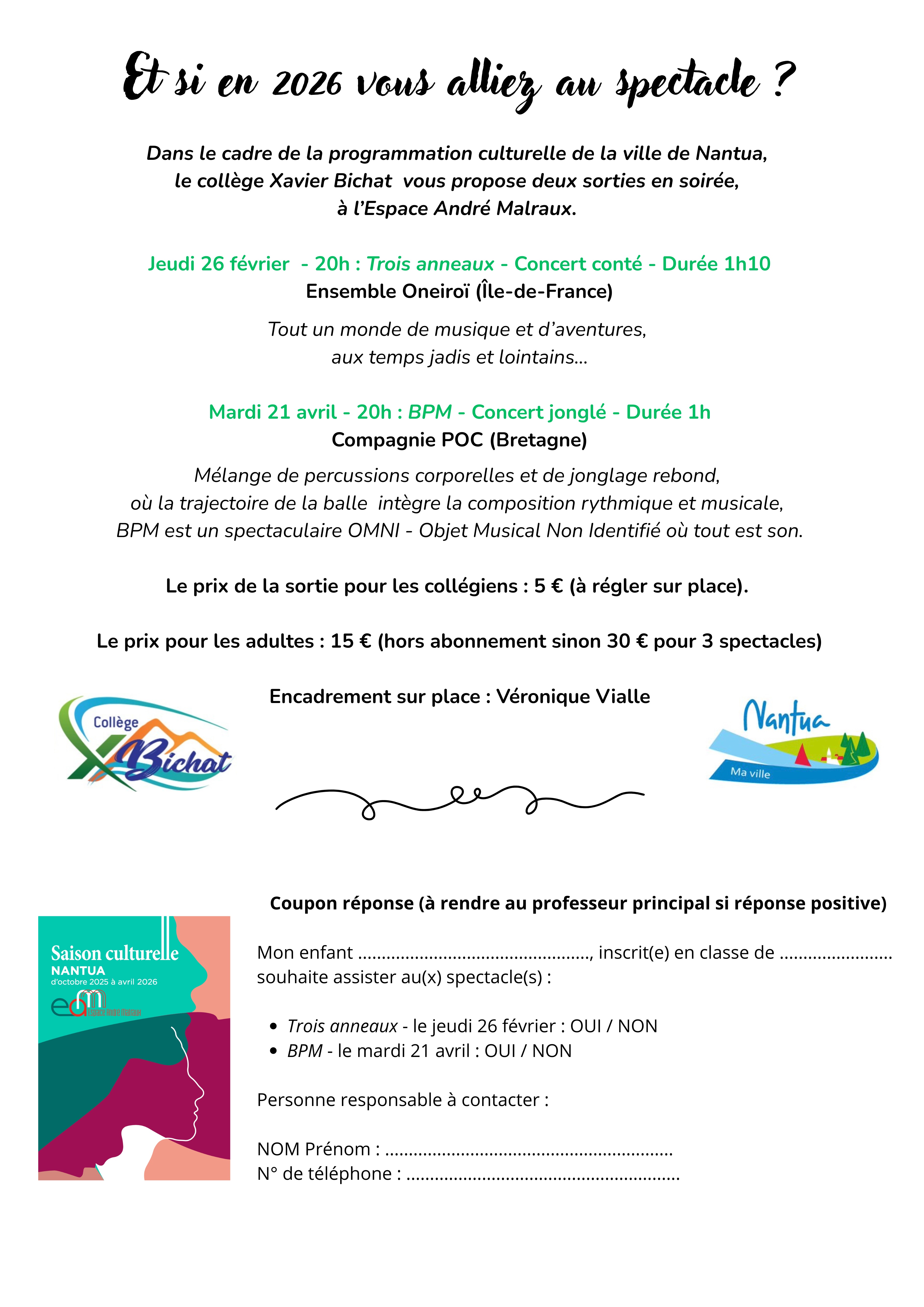 La semaine de la rentrée, vous recevrez un bon d'inscription pour deux sorties spectacle, en soirée, à Nantua, en février et avril. Ne tardez pas à vous inscrire et à rendre votre coupon réponse à votre professeur(e) principal(e).