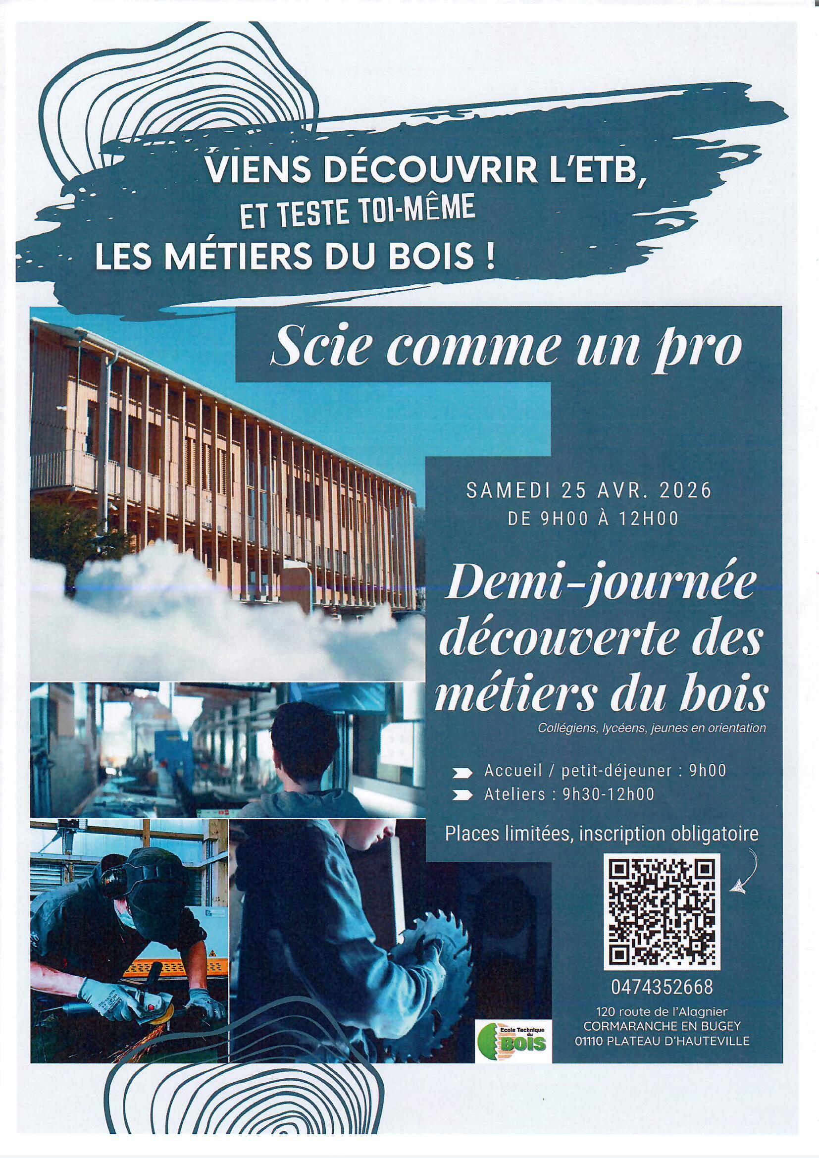 Une autre journée, le samedi 25 avril de 9H à 12H, sera consacrée à la découverte des métiers du bois à l'Ecole Technique du Bois : les inscrits pourront tester eux-mêmes les métiers du bois... (document ci-dessous)